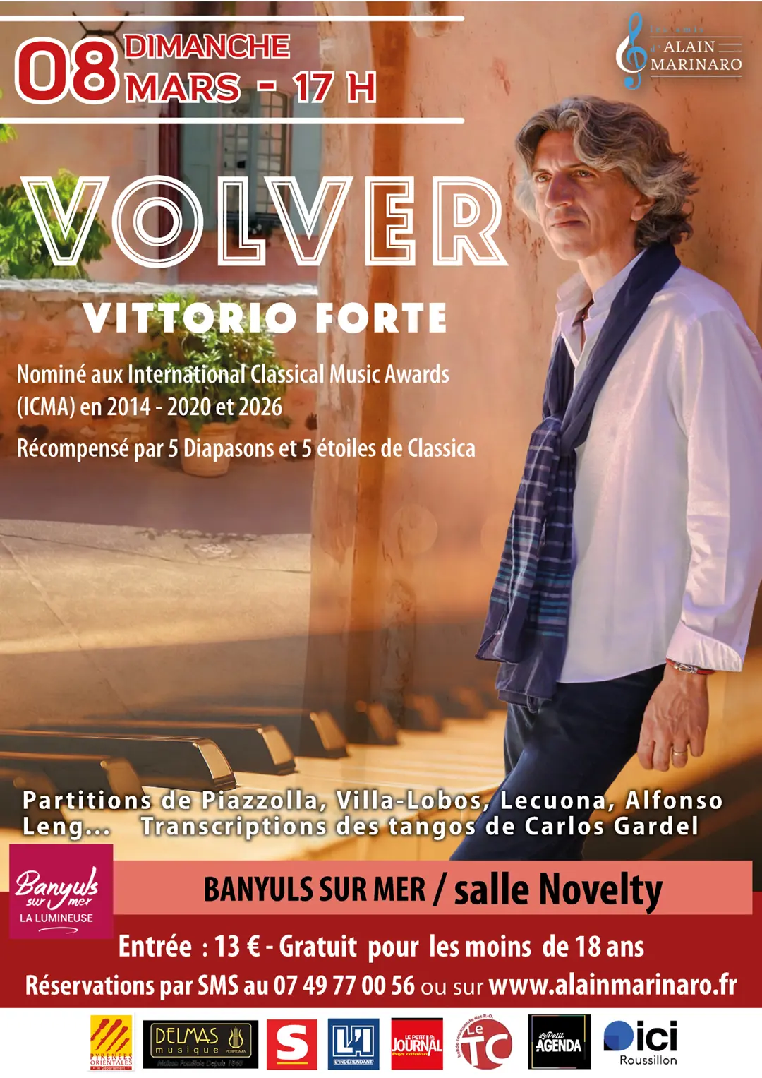Le dimanche 8 mars à 17h, un moment d’exception vous attend à la salle Novelty de Banyuls-sur-Mer. L’événement musical « L’heure musicale des amis d’Alain Marinaro » promet de vous transporter avec un récital du talentueux pianiste italien Vittorio Forte, autour de son album « VOLVER » récemment publié par Mirare.