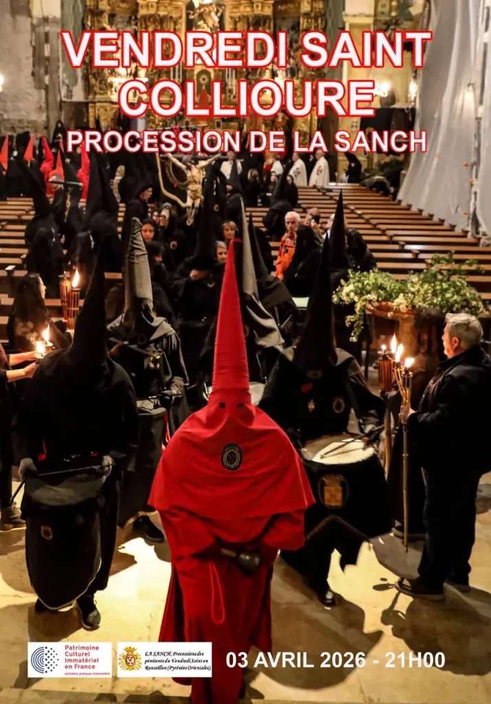 Datant du XVe siècle, cette tradition spectaculaire, organisée par la Confrérie de la Sanch de Collioure, plonge les participants dans une atmosphère unique. Les pénitents, vêtus de longues robes noires ou rouges et coiffés de capirotes – ces hauts chapeaux coniques masquant leur visage – parcourront en silence les ruelles pavées du village. Le son grave et solennel des tambours accompagnera leur marche, marquant les arrêts devant les reposoirs soigneusement décorés par les habitants. Chaque halte devient un instant d’intense recueillement, empli d’émotion et de spiritualité.